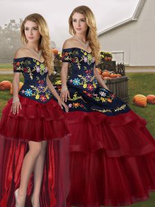 Adorable Wine Red Sleeveless Brush Train Embroidery and Ruffled Layers Sweet 16 Dress