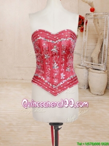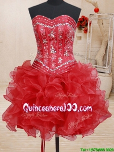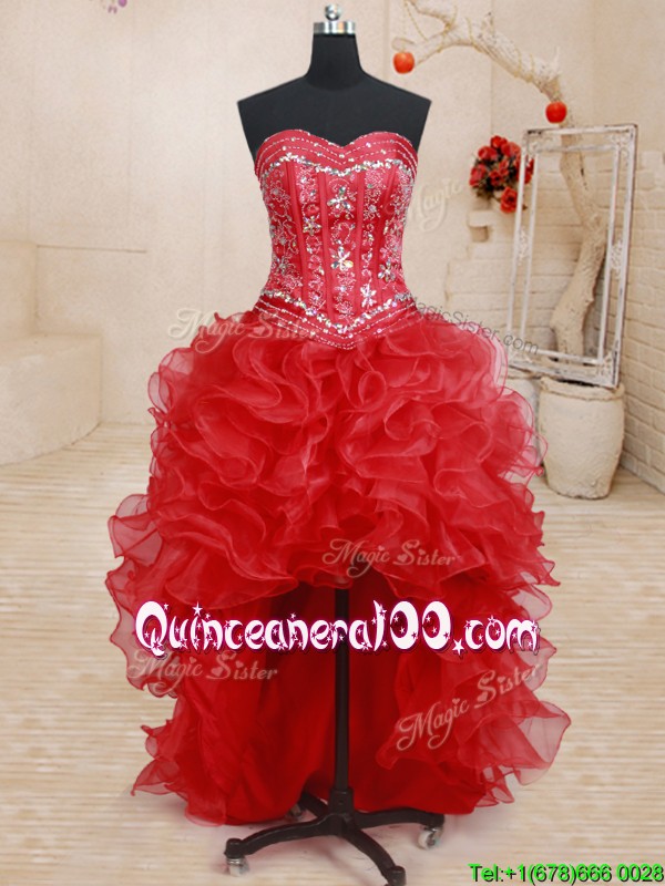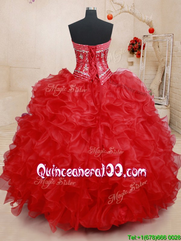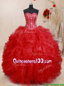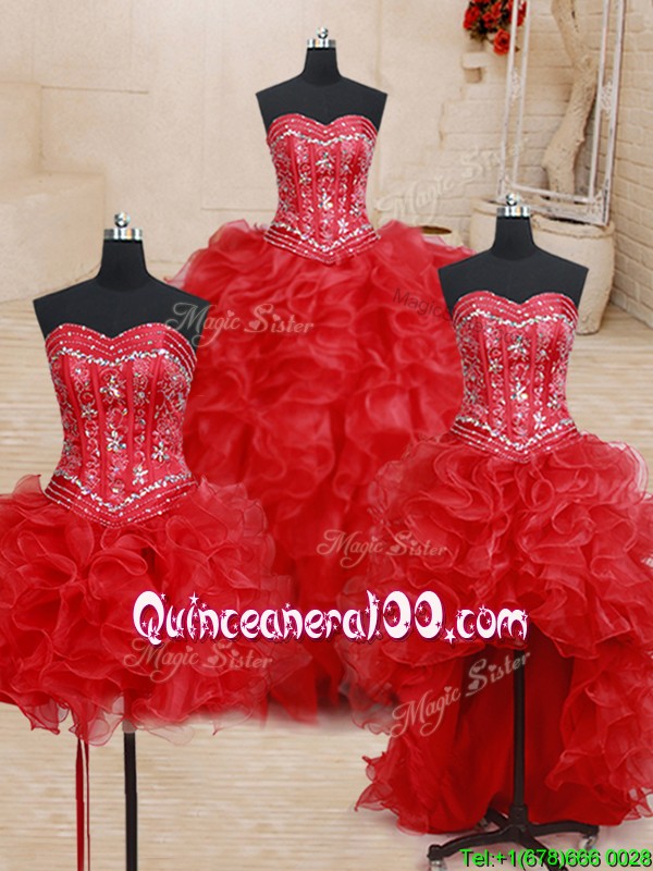 Affordable Three Piece Visible Boning Beaded and Ruffled Quinceanera Dress in Red
