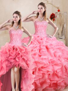 Affordable Watermelon Red Sleeveless Floor Length Beading and Ruffles Lace Up 15th Birthday Dress