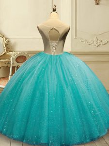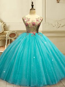 Aqua Blue Lace Up Quinceanera Dresses Appliques and Sequins Sleeveless Floor Length