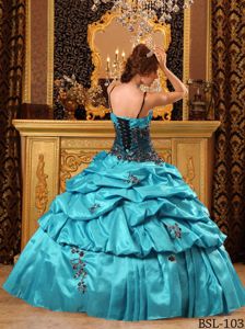 Aqua Blue Taffeta Quinceanera with Spaghetti Straps and Appliques