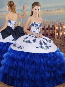Artistic Royal Blue Lace Up Sweetheart Embroidery and Ruffled Layers and Bowknot 15th Birthday Dress Organza Sleeveless