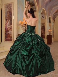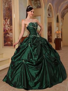 Beading and Ruche Hunter Green Strapless Taffeta Dresses For a QuinceBeading and Ruche Hunter Green Strapless Taffeta Dresses For a Quince