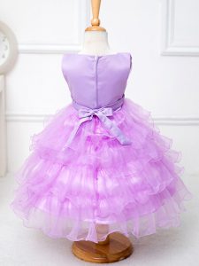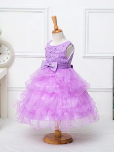 Beauteous Lilac Organza Zipper Pageant Dress for Teens Sleeveless Tea Length Ruffled Layers and Bowknot
