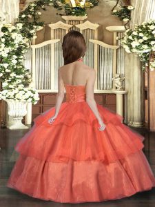Best Coral Red Organza Lace Up Kids Formal Wear Sleeveless Floor Length Ruffled Layers
