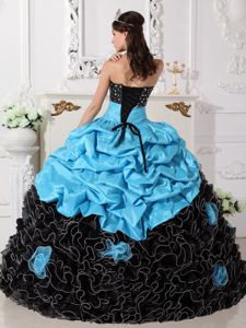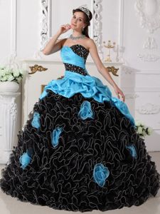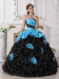 Blue and Black Sweet 15 Dress with Ruffles and Rolling Flowers