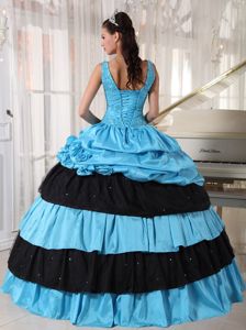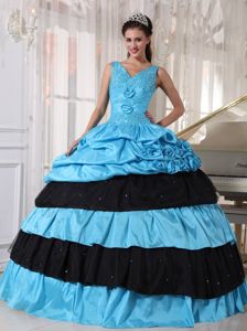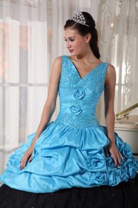 Blue and Black V-neck Sweet 16 Dresses with Appliques FlowersBlue and Black V-neck Sweet 16 Dresses with Appliques Flowers