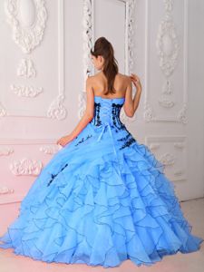 Blue Ball Gown Strapless Sweet 16 Dress with Ruffles and AppliquesBlue Ball Gown Strapless Sweet 16 Dress with Ruffles and Appliques