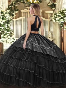 Brown Organza Backless Halter Top Sleeveless Floor Length Ball Gown Prom Dress Beading and Embroidery and Ruffled Layers
