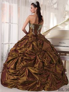 Brown Strapless Taffeta Dress for Quinceanera with Pick-upsBrown Strapless Taffeta Dress for Quinceanera with Pick-ups