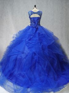 Brush Train Ball Gowns Quinceanera Dresses Royal Blue Scoop Tulle Sleeveless Lace Up