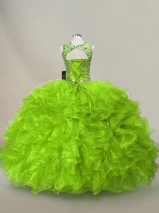 Captivating Sleeveless Floor Length Ruffles and Sequins Lace Up Quince Ball Gowns with Green