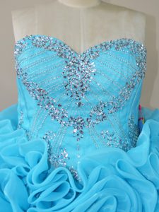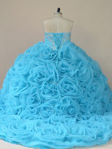 Charming Baby Blue Fabric With Rolling Flowers Side Zipper Vestidos de Quinceanera Sleeveless Brush Train Beading