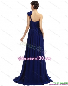 Cheap 2015 One Shoulder Ruffled Navy Blue Dama Dresses with Hand Made Flower