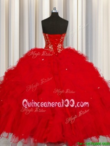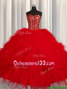 Cheap Visible Boning Red Lace Up Sweetheart Beading and Ruffles and Sequins Quinceanera Gown Tulle Sleeveless