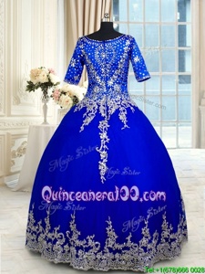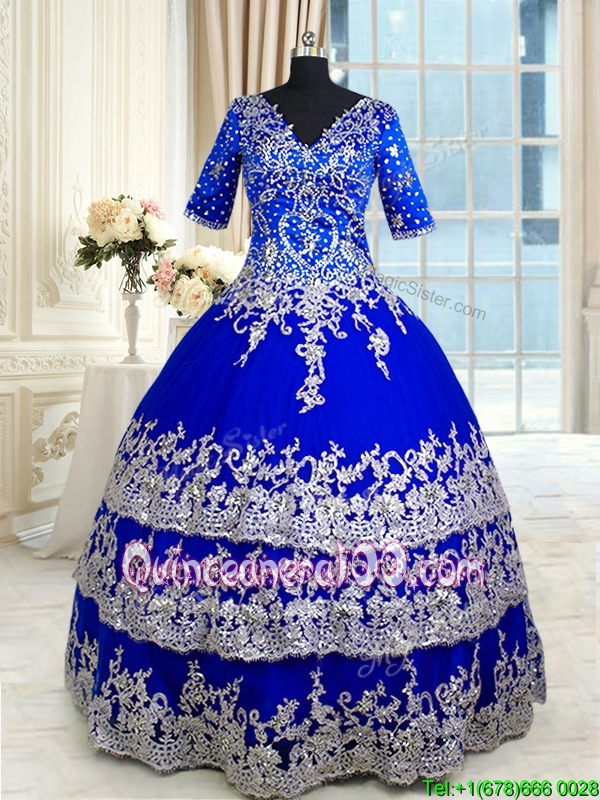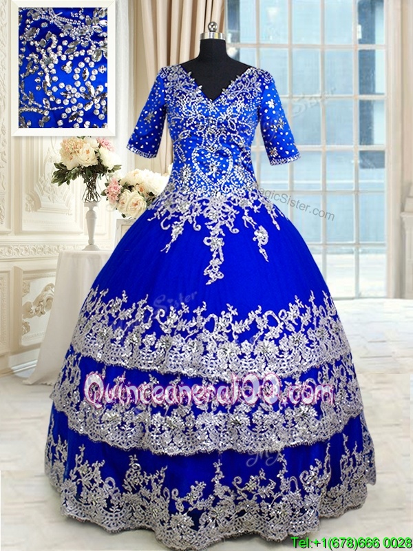 Chic Ruffled Floor Length Ball Gowns Half Sleeves Royal Blue Quinceanera Gowns Zipper