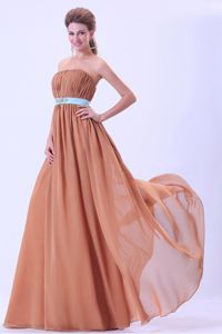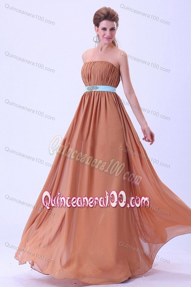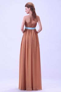 Chocolate Dama Dress With a Blue Belt and Ruches in Chiffon