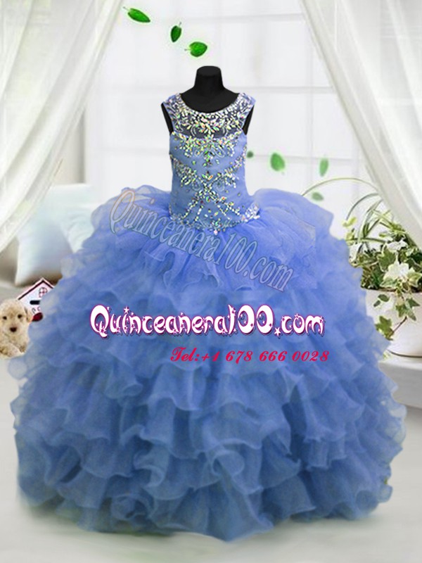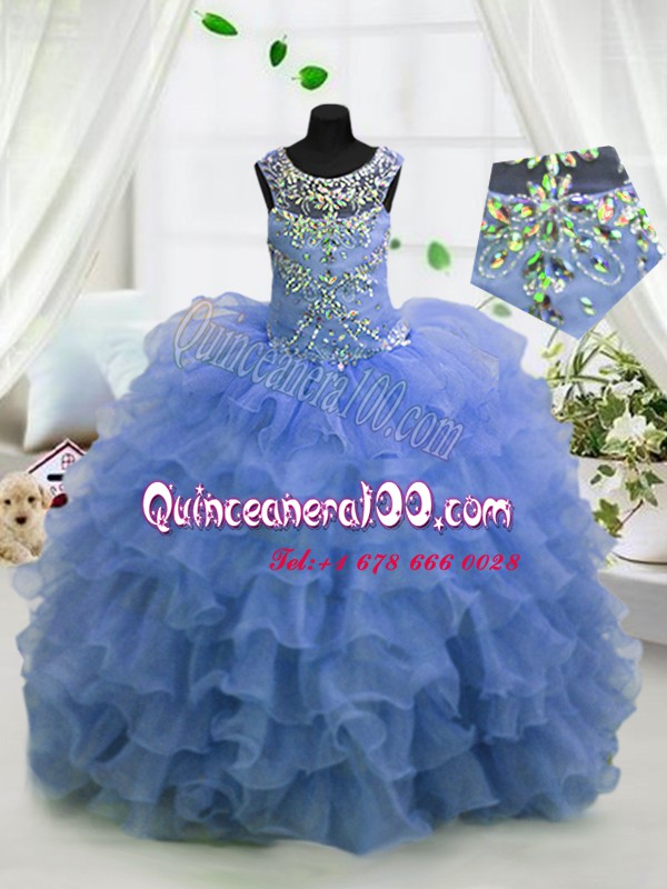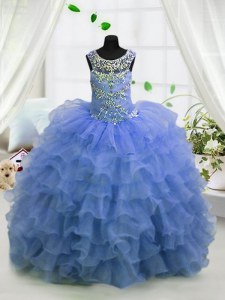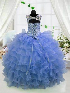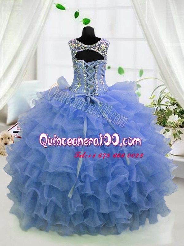 Classical Scoop Floor Length Light Blue Pageant Dress for Teens Organza Sleeveless Beading and Ruffled Layers