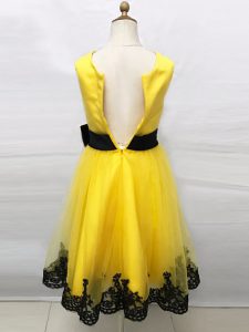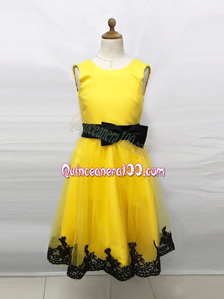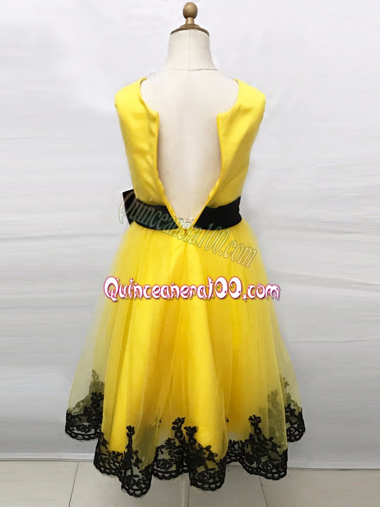 Colorful Sleeveless Tulle Tea Length Zipper Flower Girl Dresses for Less in Yellow with Lace and Belt