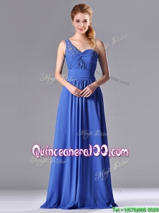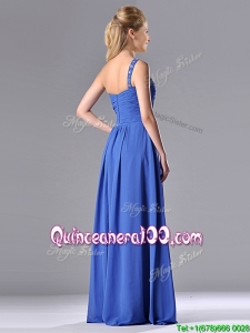 Column Chiffon Beading and Ruching Blue Dama Dress with One Shoulder