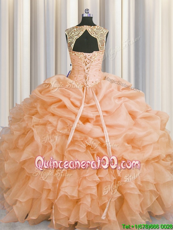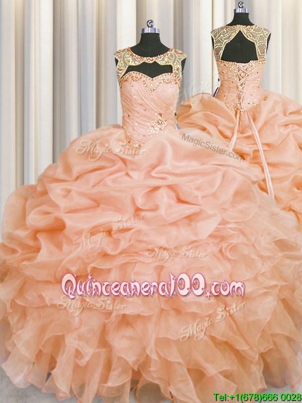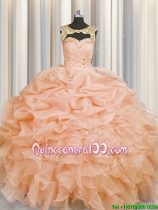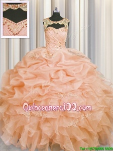 Custom Design Scoop Peach Sleeveless Floor Length Beading and Pick Ups Lace Up 15 Quinceanera Dress