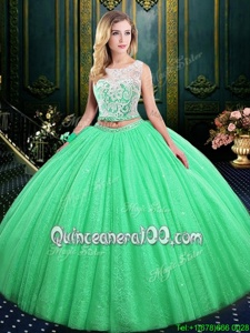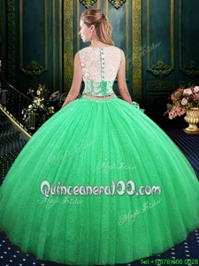 Custom Designed Spring Green Tulle and Sequined Lace Up Scoop Sleeveless Floor Length 15th Birthday Dress Lace and Sequins
