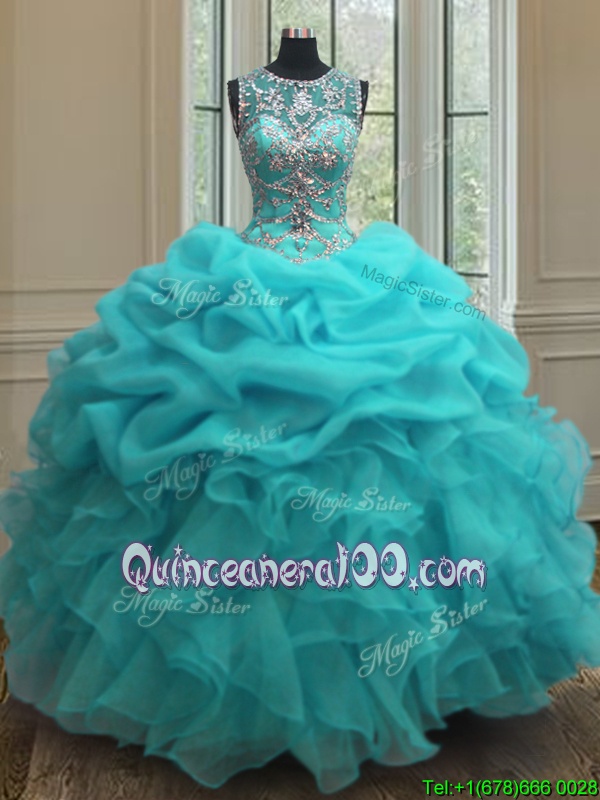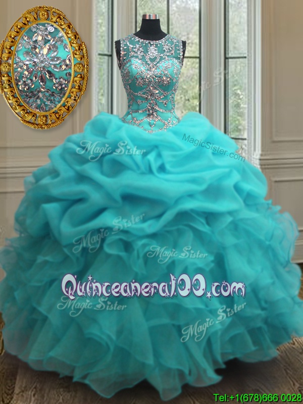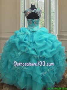 Custom Fit Scoop Sleeveless Floor Length Beading and Ruffles Lace Up Quinceanera Dresses with Baby Blue