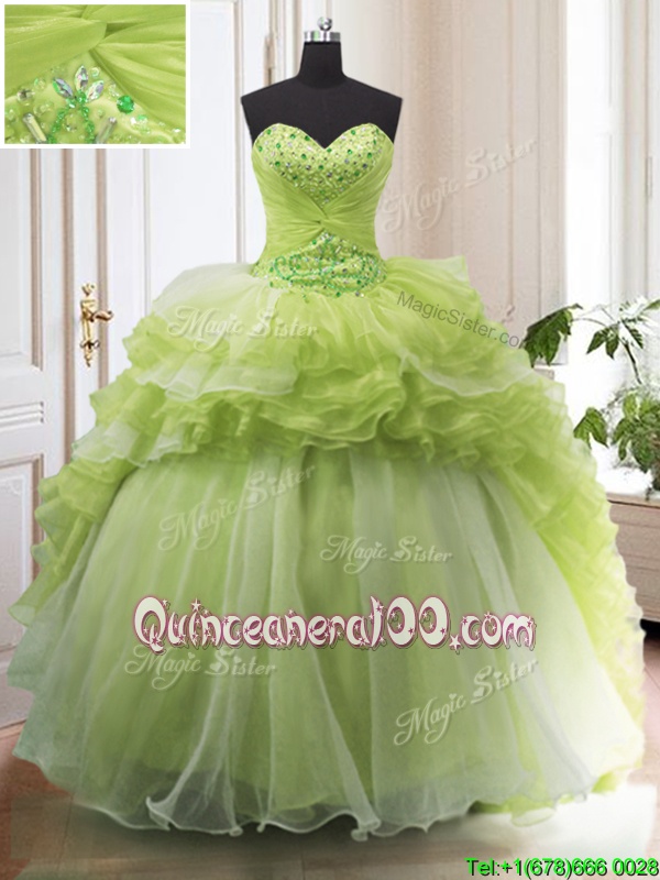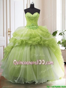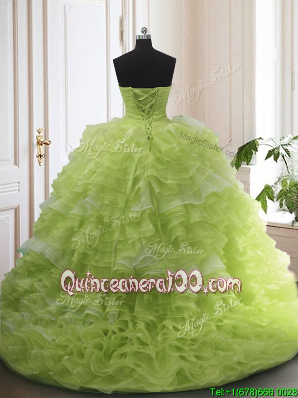 Decent Sleeveless Organza With Train Sweep Train Lace Up Quinceanera Dresses inYellow Green forSpring and Summer and Fall and Winter withBeading and Ruffled Layers