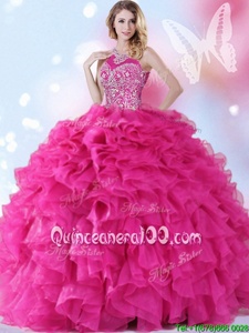 Delicate Halter Top Spring and Summer and Fall and Winter Organza Sleeveless Floor Length Quince Ball Gowns andBeading and Ruffles