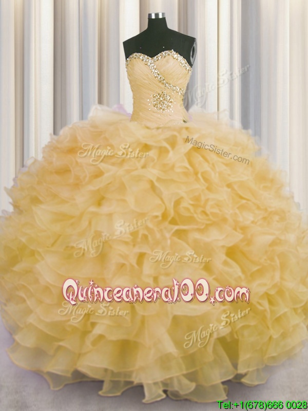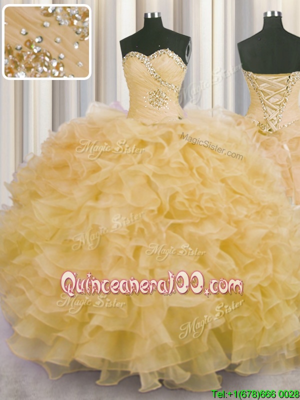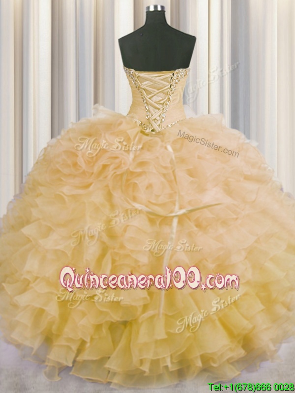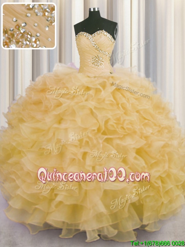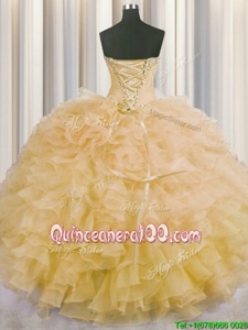 Designer Champagne Ball Gowns Organza Sweetheart Sleeveless Beading and Ruffles Floor Length Lace Up Sweet 16 Quinceanera Dress