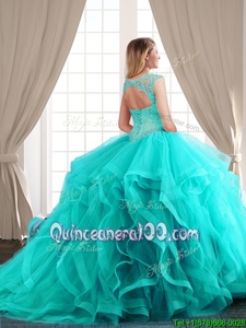 Designer Scoop Cap Sleeves With Train Lace Up Ball Gown Prom Dress Fuchsia and In forMilitary Ball and Sweet 16 and Quinceanera withBeading and Appliques and Ruffles Brush Train