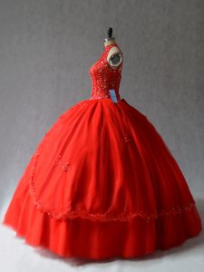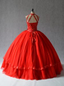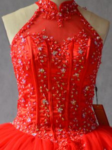 Discount Red Ball Gowns Tulle Halter Top Sleeveless Appliques Floor Length Lace Up Quinceanera Dress