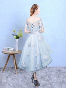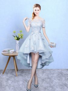 Dramatic Lace Damas Dress Light Blue Lace Up Short Sleeves High Low