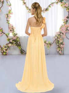 Dramatic One Shoulder Sleeveless Chiffon Court Dresses for Sweet 16 Hand Made Flower Brush Train Lace Up