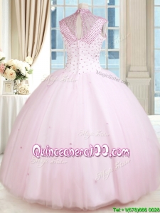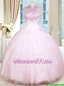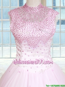 Latest See Through Beaded Decorated High Neck Zipper Up Baby Pink Quinceanera Dress in Tulle