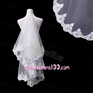 Angle Cut Two-Tier Lace Appliques Edge Chapel Bridal Veils