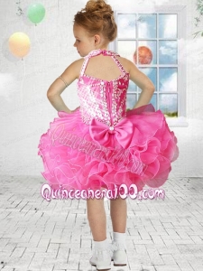 Ball Gown Halter Mini-length Bowknot Beading Hot Pink Little Girl Dress