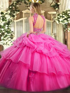 Eggplant Purple Ball Gowns High-neck Sleeveless Tulle Floor Length Backless Beading and Ruffles and Pick Ups Quinceanera Gowns