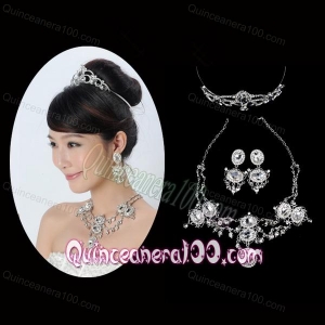 Elegant Rhinestone Wedding Jewelry Set Including Drop Earrings Crown And Necklace