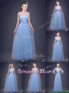 Exceptional Light Blue Lace Up Vestidos de Damas Appliques and Ruching and Bowknot Sleeveless Floor Length