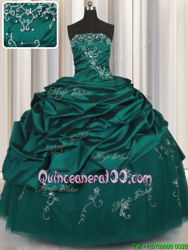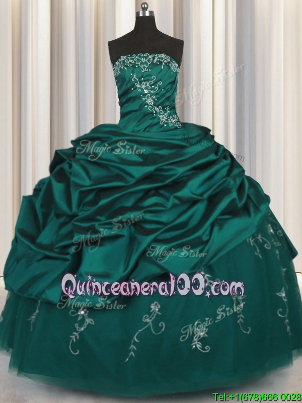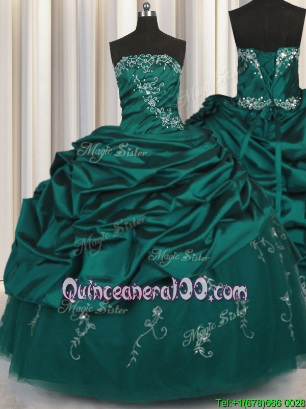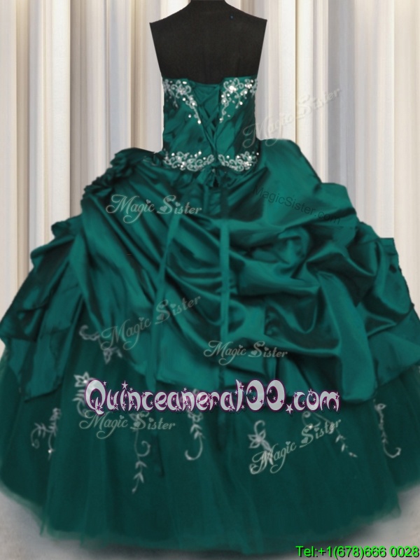 Extravagant Sleeveless Taffeta Floor Length Lace Up 15 Quinceanera Dress inPeacock Green forSpring and Summer and Fall and Winter withBeading and Appliques and Embroidery and Pick Ups