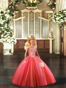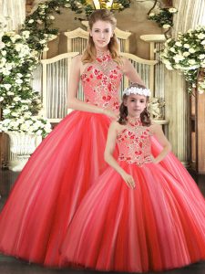 Fancy Halter Top Sleeveless Lace Up Sweet 16 Quinceanera Dress Coral Red Tulle