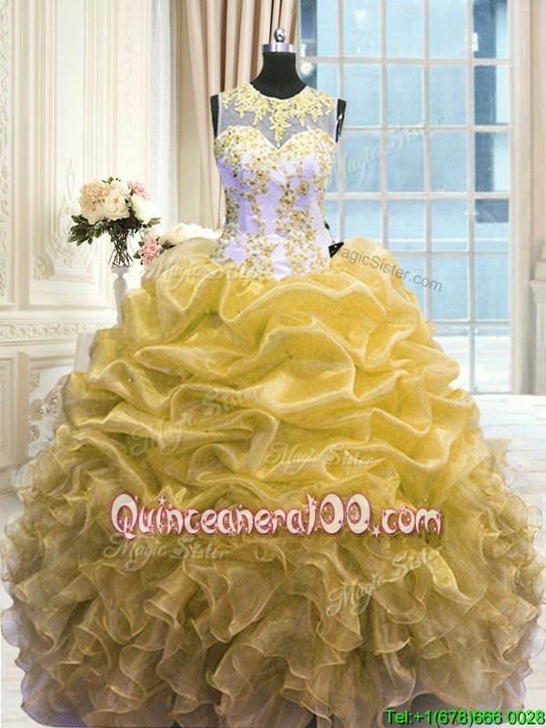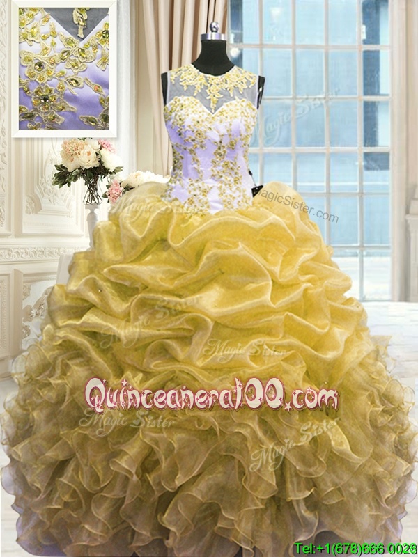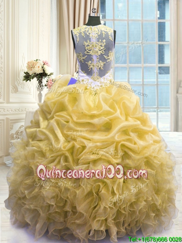 Fancy Scoop Floor Length Ball Gowns Sleeveless Gold Quinceanera Dress Zipper