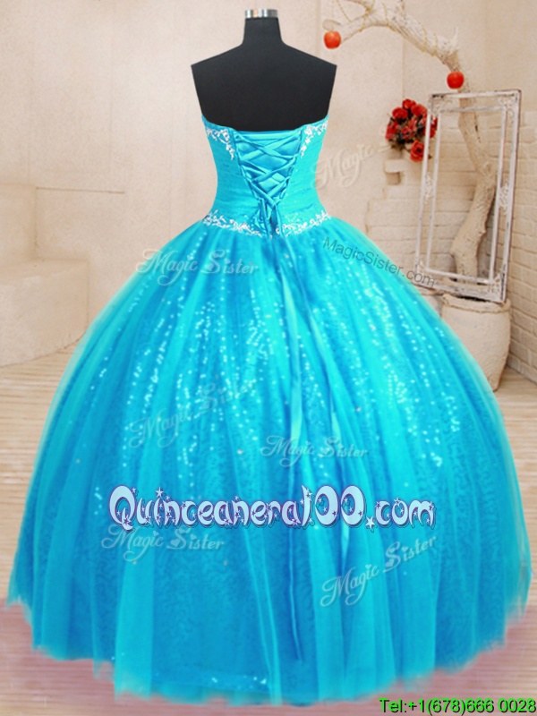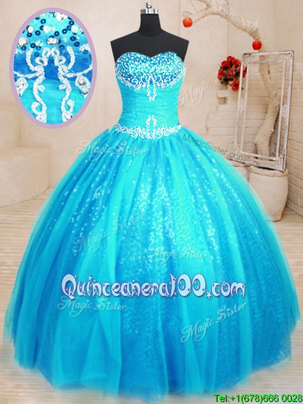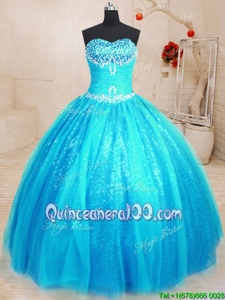 Fashion Baby Blue Ball Gowns Tulle and Sequined Sweetheart Sleeveless Beading and Appliques Floor Length Lace Up Vestidos de Quinceanera