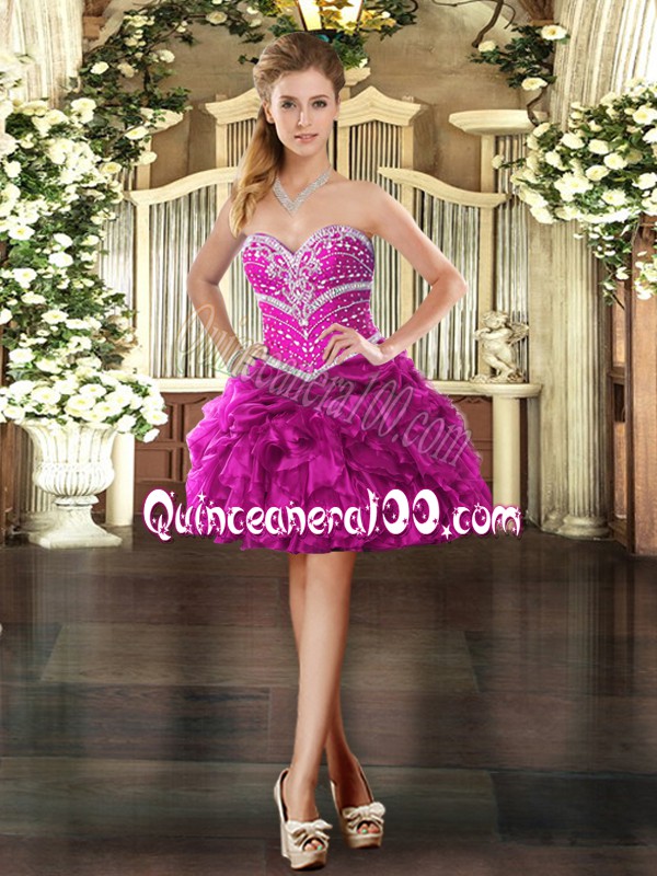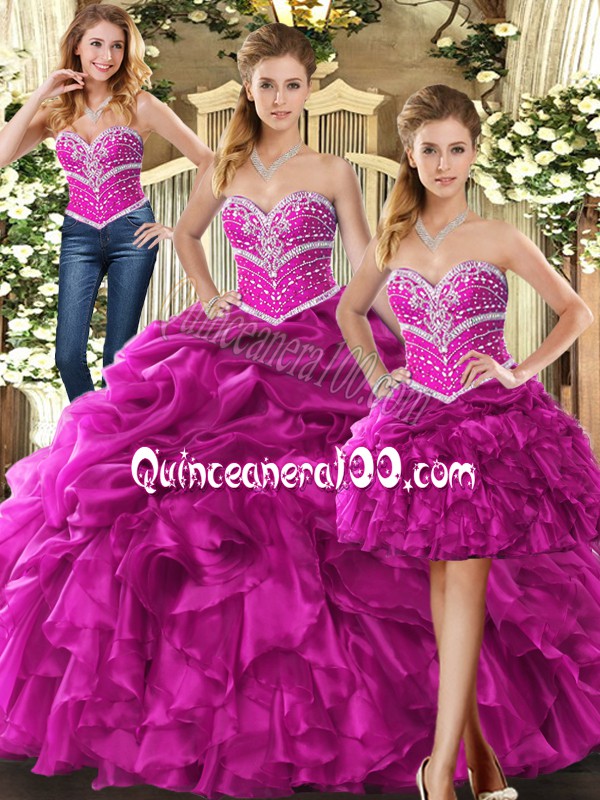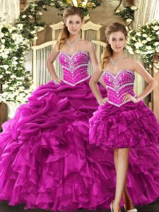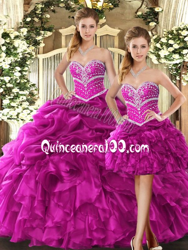 Fitting Sleeveless Floor Length Beading and Ruffles Lace Up Vestidos de Quinceanera with Fuchsia