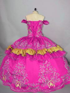 Fuchsia Satin Side Zipper Off The Shoulder Sleeveless Floor Length Ball Gown Prom Dress Embroidery