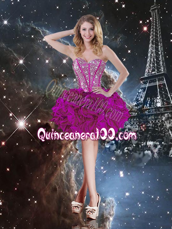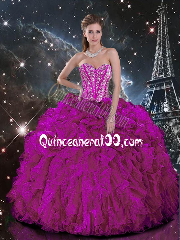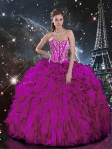 Fuchsia Sleeveless Floor Length Beading and Ruffles Lace Up 15th Birthday Dress