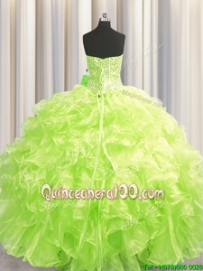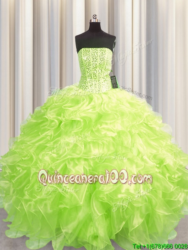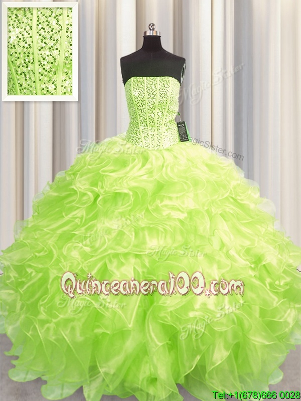 Glittering Visible Boning Ball Gowns 15 Quinceanera Dress Yellow Green Strapless Organza Sleeveless Floor Length Lace Up