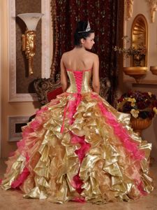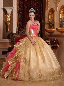 inexpensive ball gowns quinceanera dress from online store in pucallpa, Gold Weave Quinceanera Dress with Embroidery and Ruffles