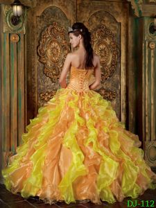 Golden and Yellow Sweet 15 Dresses with Appliques and RufflesGolden and Yellow Sweet 15 Dresses with Appliques and Ruffles